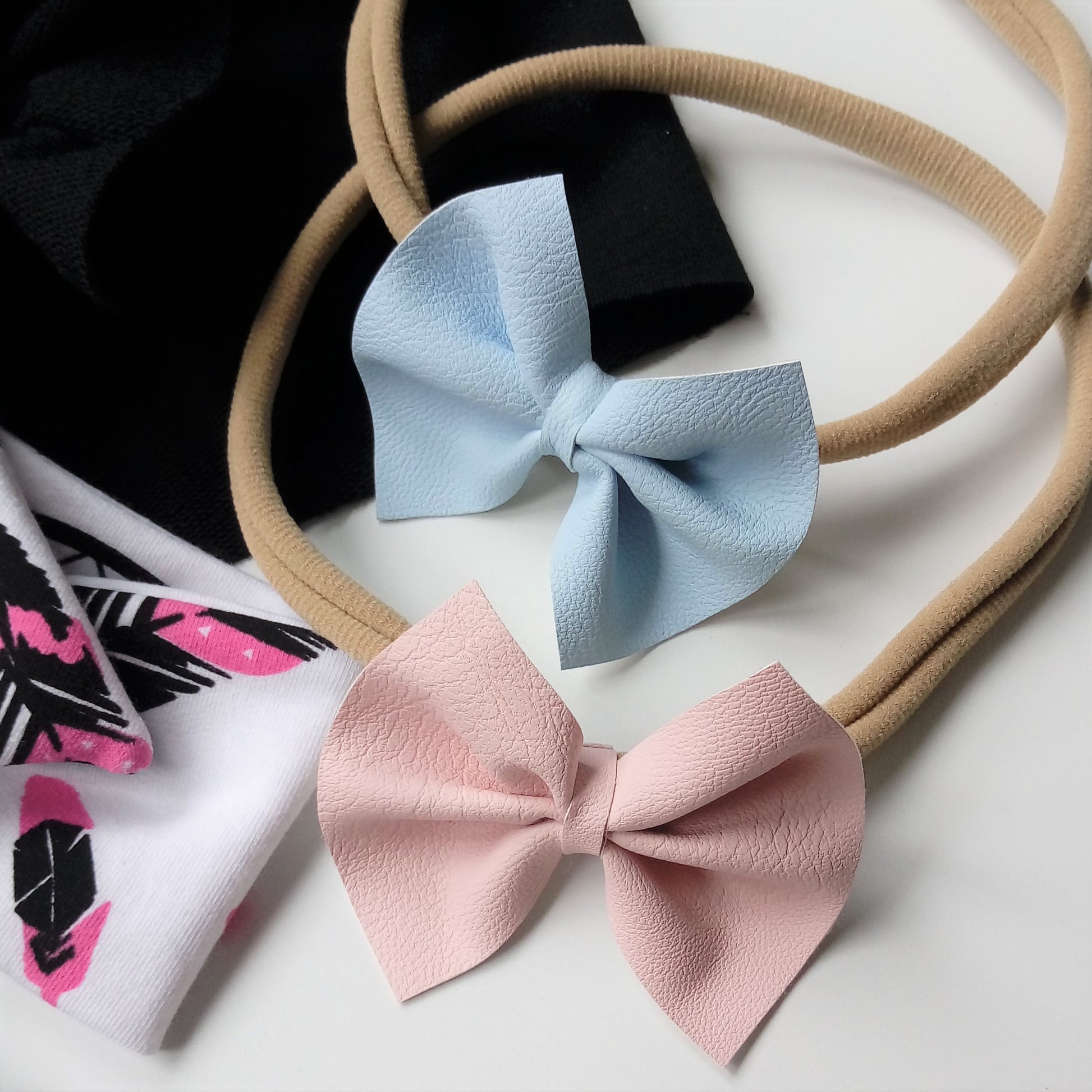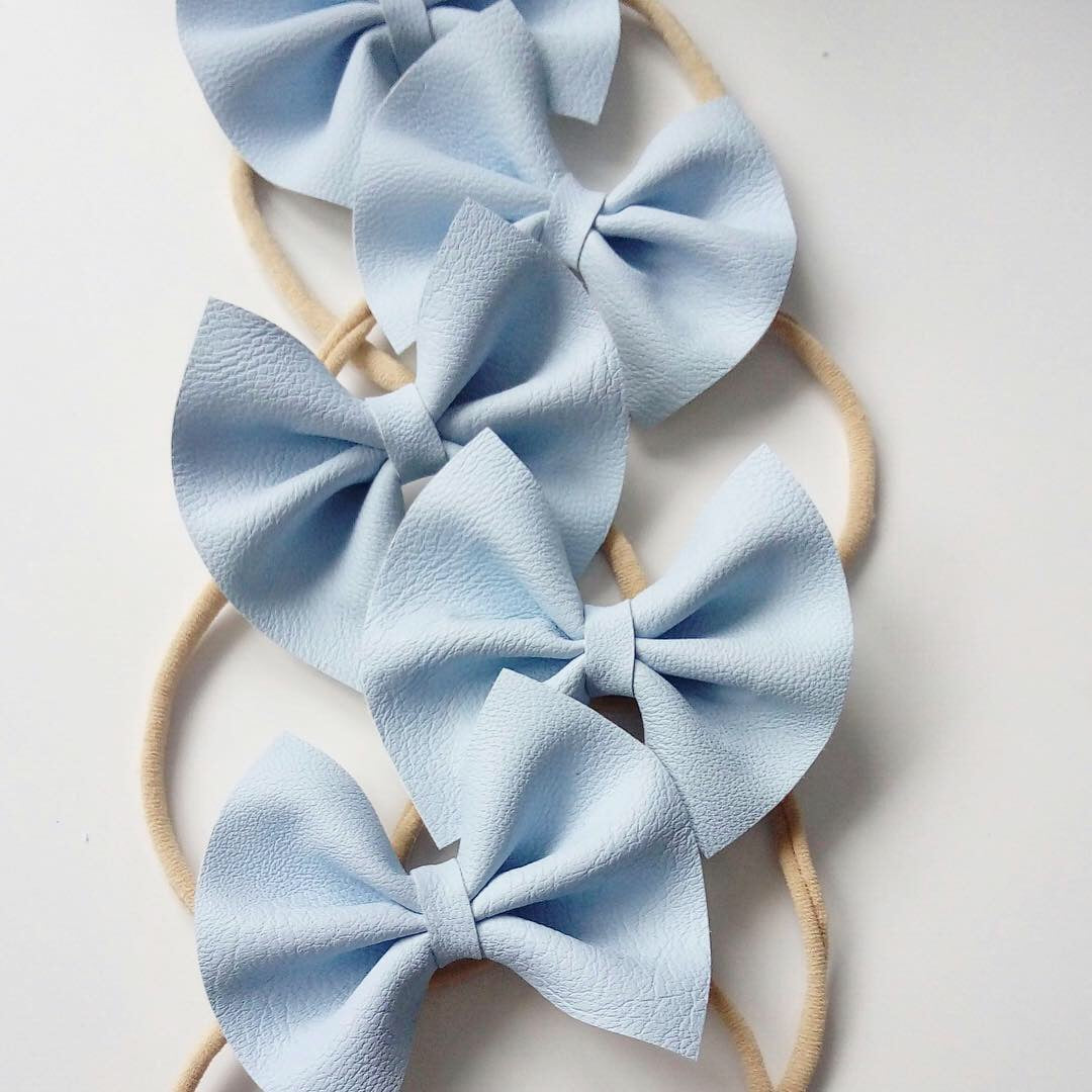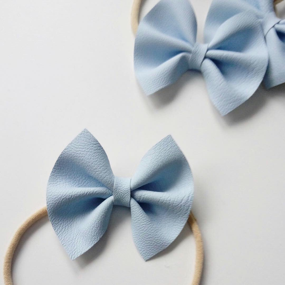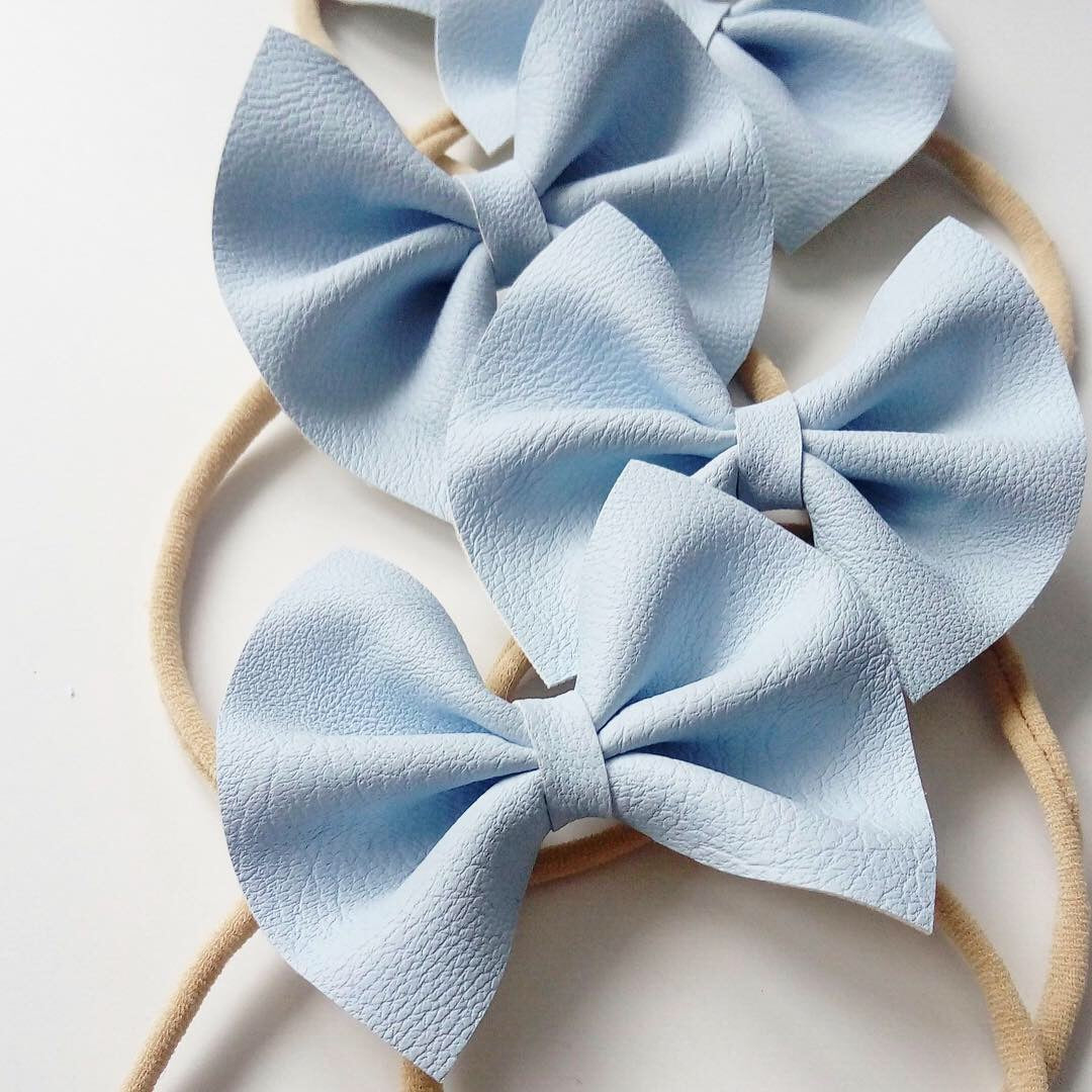 Nydelig håndlaget skinn sløyfehårbånd som passer både baby og større pike. Lengde på sløyfen er 6 cm. Farge: blå. One size/strikket er elastisk. Material: polyuretan/polyester. Designet og produsert i EU.